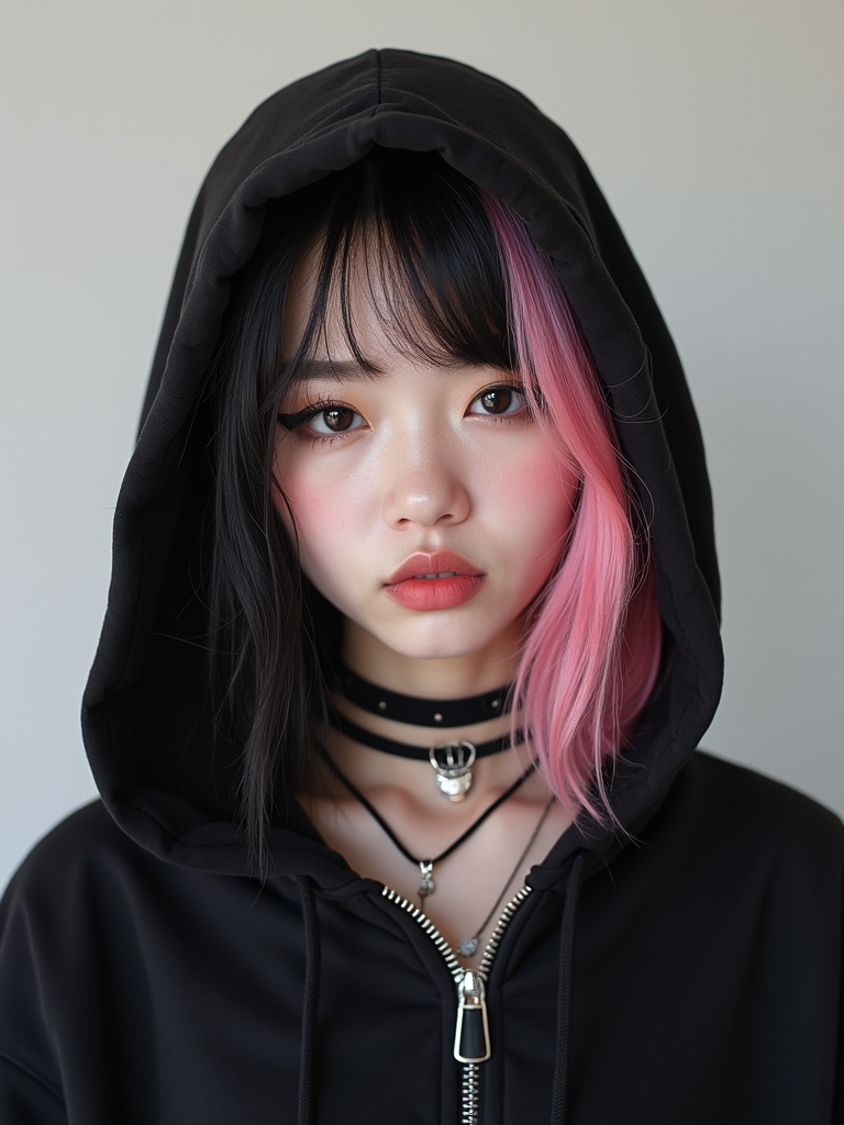Model as an E-Girl. Wearing a black oversized hoodie, choker necklace, heavy winged eyeliner, split-dyed pastel pink and black hair . Edgy alternative fashion, TikTok aesthetic.