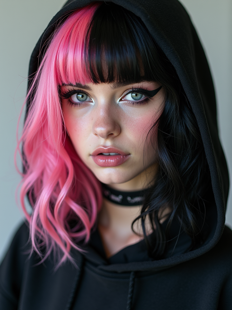 Model as an E-Girl. Wearing a black oversized hoodie, choker necklace, heavy winged eyeliner, split-dyed pastel pink and black hair . Edgy alternative fashion, TikTok aesthetic.