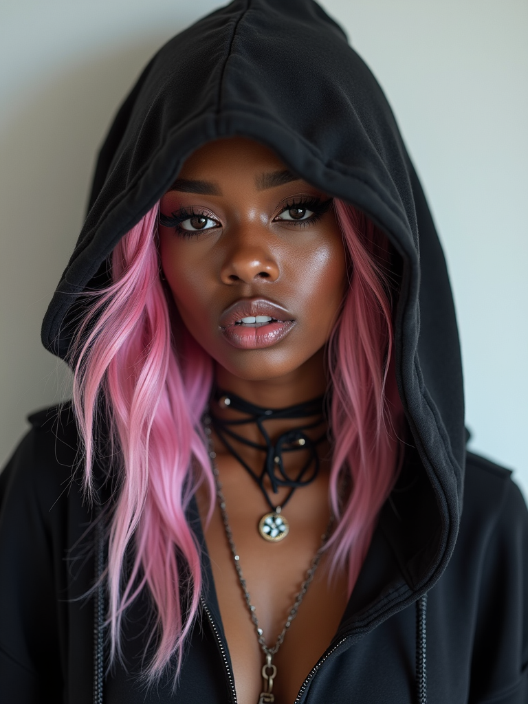 Model as an E-Girl. Wearing a black oversized hoodie, choker necklace, heavy winged eyeliner, split-dyed pastel pink and black hair . Edgy alternative fashion, TikTok aesthetic.