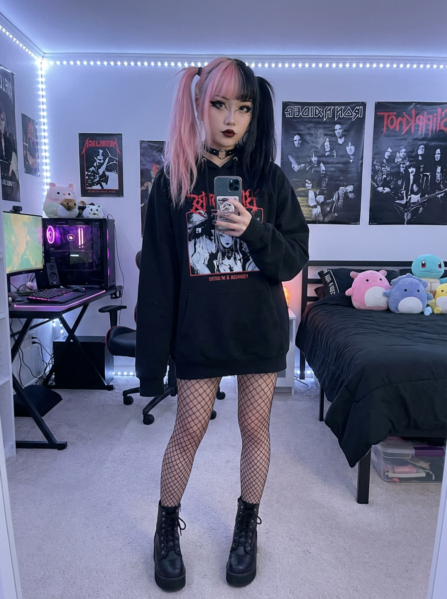 Model as an E-Girl. Wearing a black oversized hoodie, choker necklace, heavy winged eyeliner, split-dyed pastel pink and black hair . Edgy alternative fashion, TikTok aesthetic.