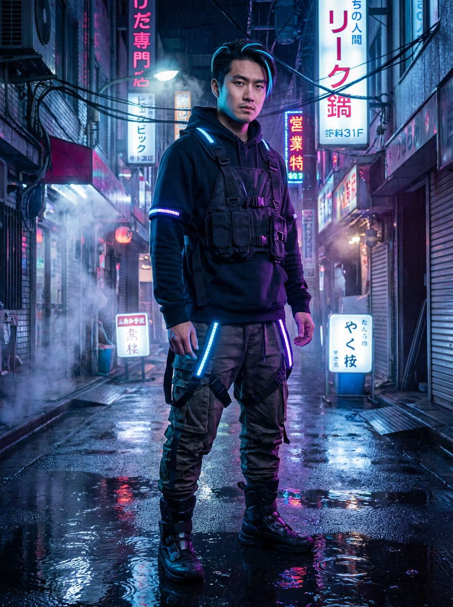 Model cyberpunk Tokyo portrait. Dark hoodie, neon streaks in hair, futuristic techwear. Blade Runner aesthetic.