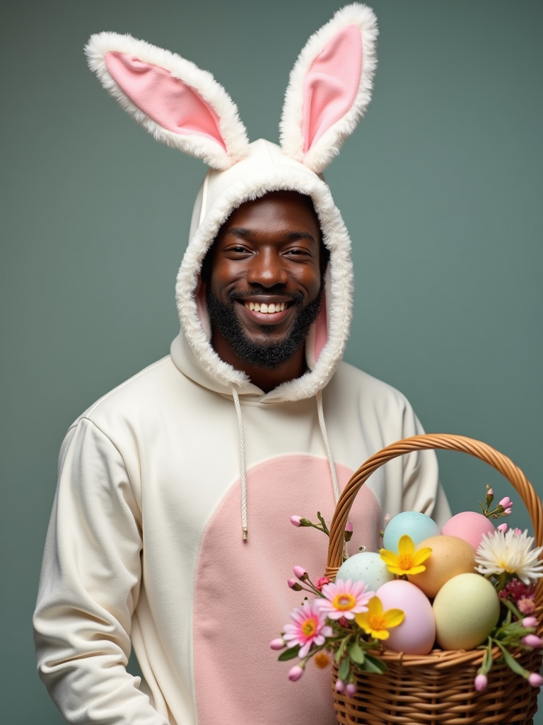 Model dressed in a cute bunny costume with pastel-colored ears, posing next to a basket of decorated Easter eggs and spring flowers.