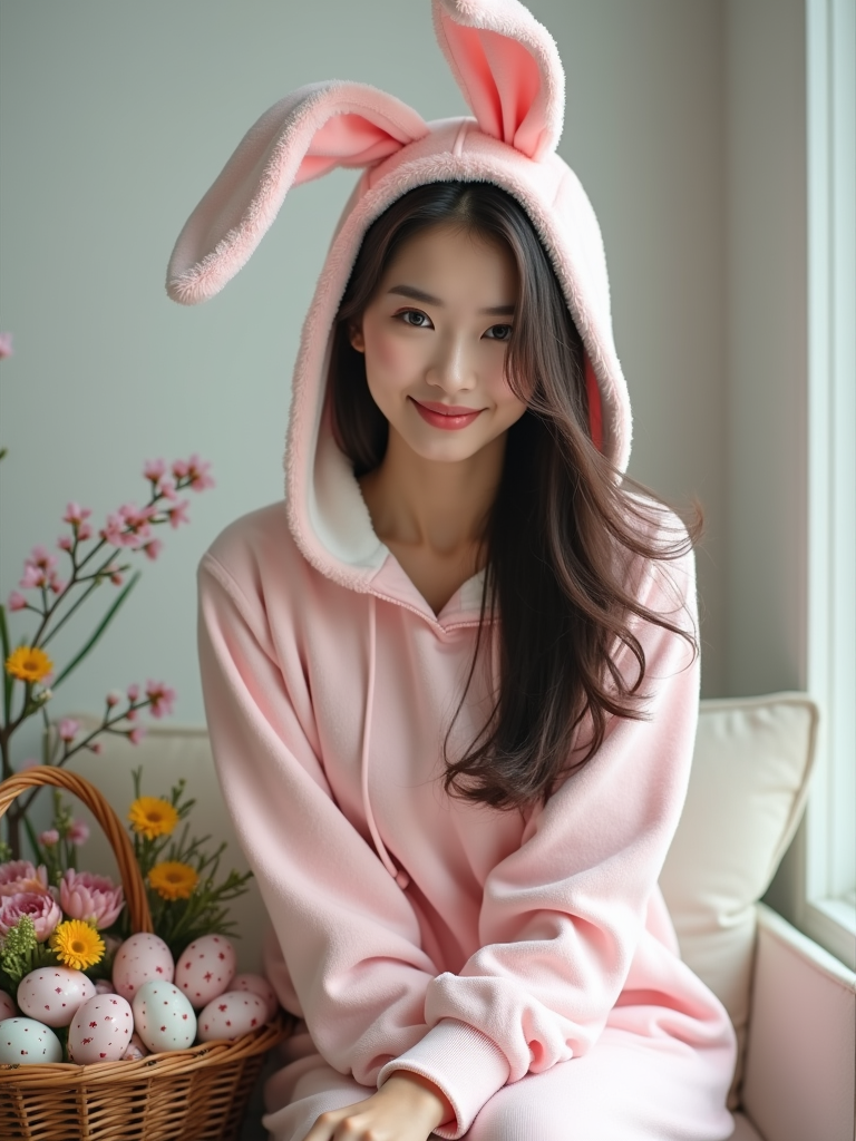 Model dressed in a cute bunny costume with pastel-colored ears, posing next to a basket of decorated Easter eggs and spring flowers.