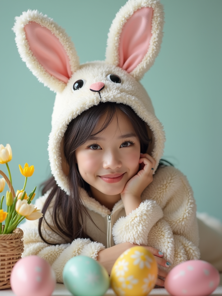 Model dressed in a cute bunny costume with pastel-colored ears, posing next to a basket of decorated Easter eggs and spring flowers.