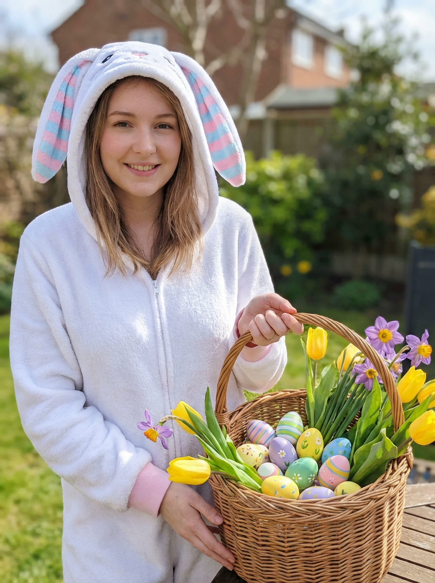 Model dressed in a cute bunny costume with pastel-colored ears, posing next to a basket of decorated Easter eggs and spring flowers.