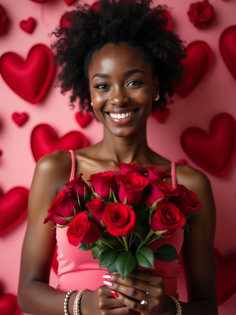 Model holding a bouquet of roses, smiling in front of a heart-shaped backdrop with Valentine's Day decorations like chocolates and rose petals.
