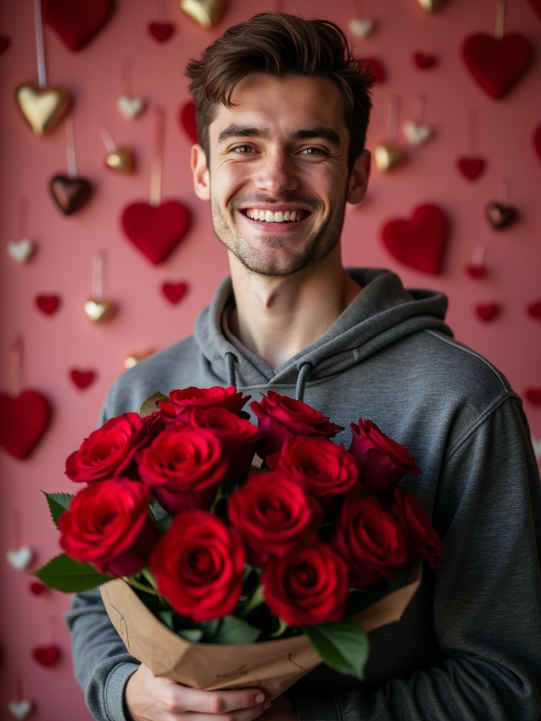 Model holding a bouquet of roses, smiling in front of a heart-shaped backdrop with Valentine's Day decorations like chocolates and rose petals.