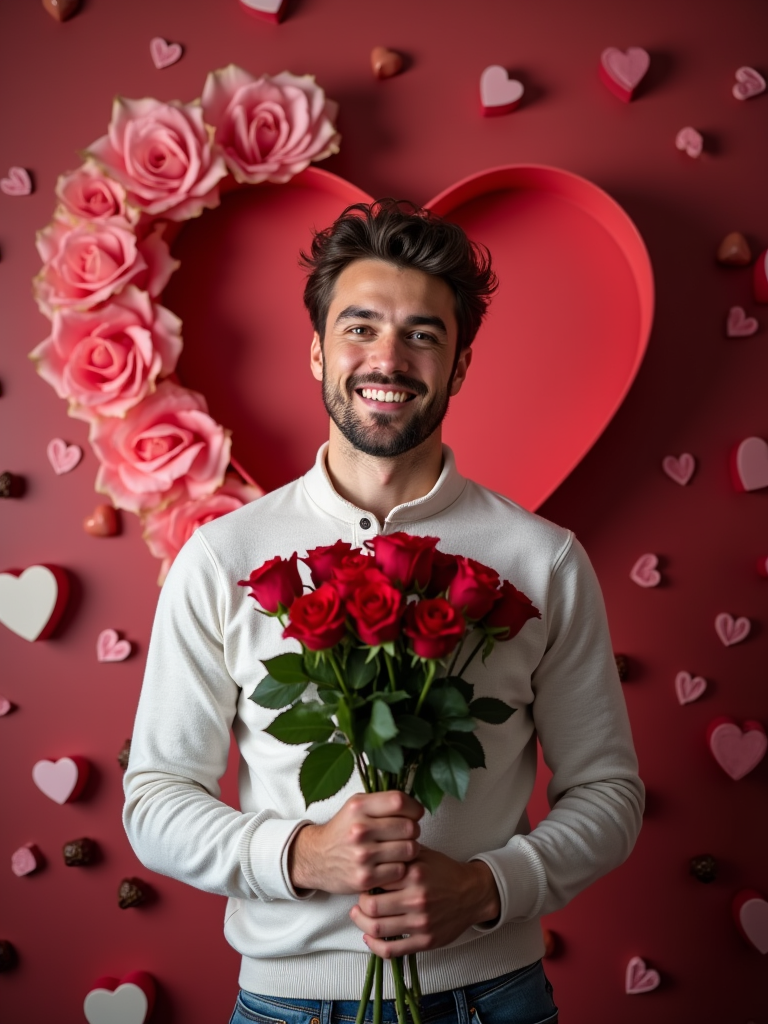 Model holding a bouquet of roses, smiling in front of a heart-shaped backdrop with Valentine's Day decorations like chocolates and rose petals.