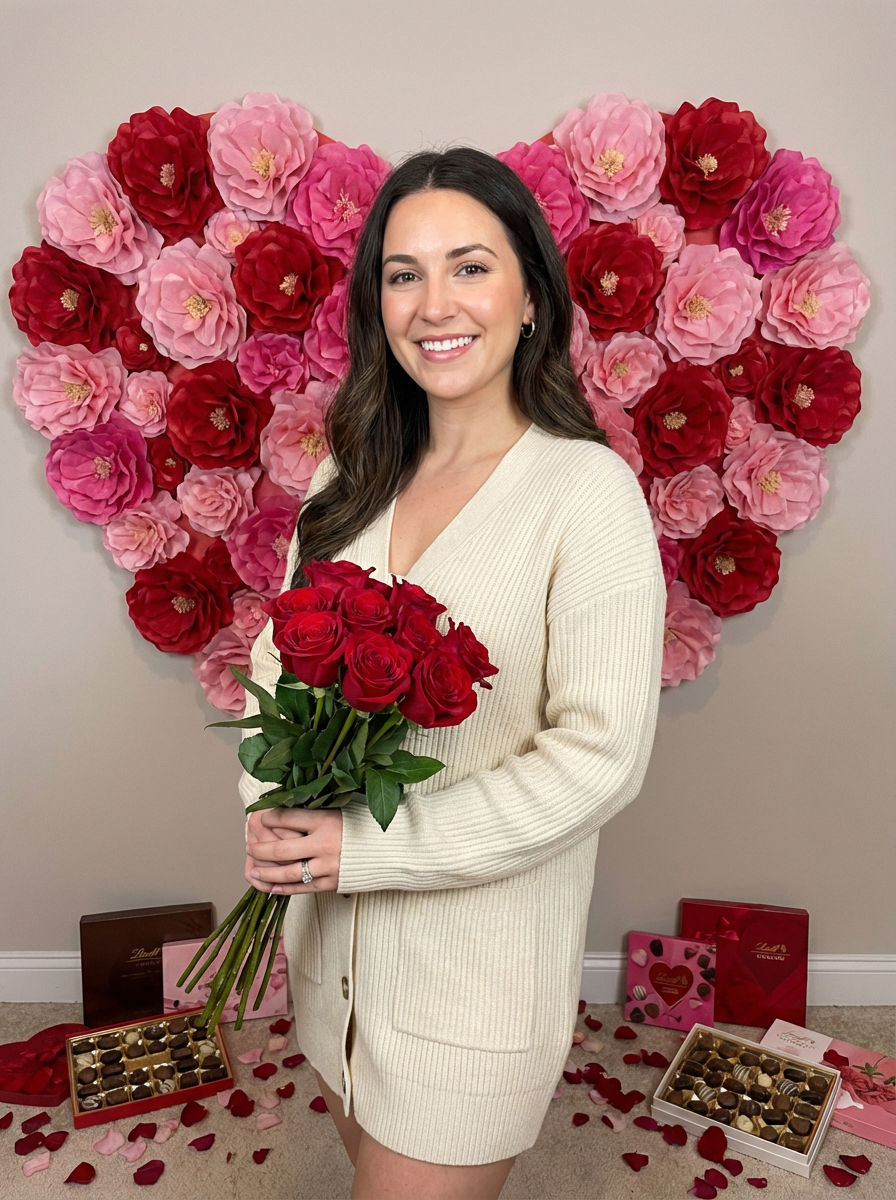 Model holding a bouquet of roses, smiling in front of a heart-shaped backdrop with Valentine's Day decorations like chocolates and rose petals.