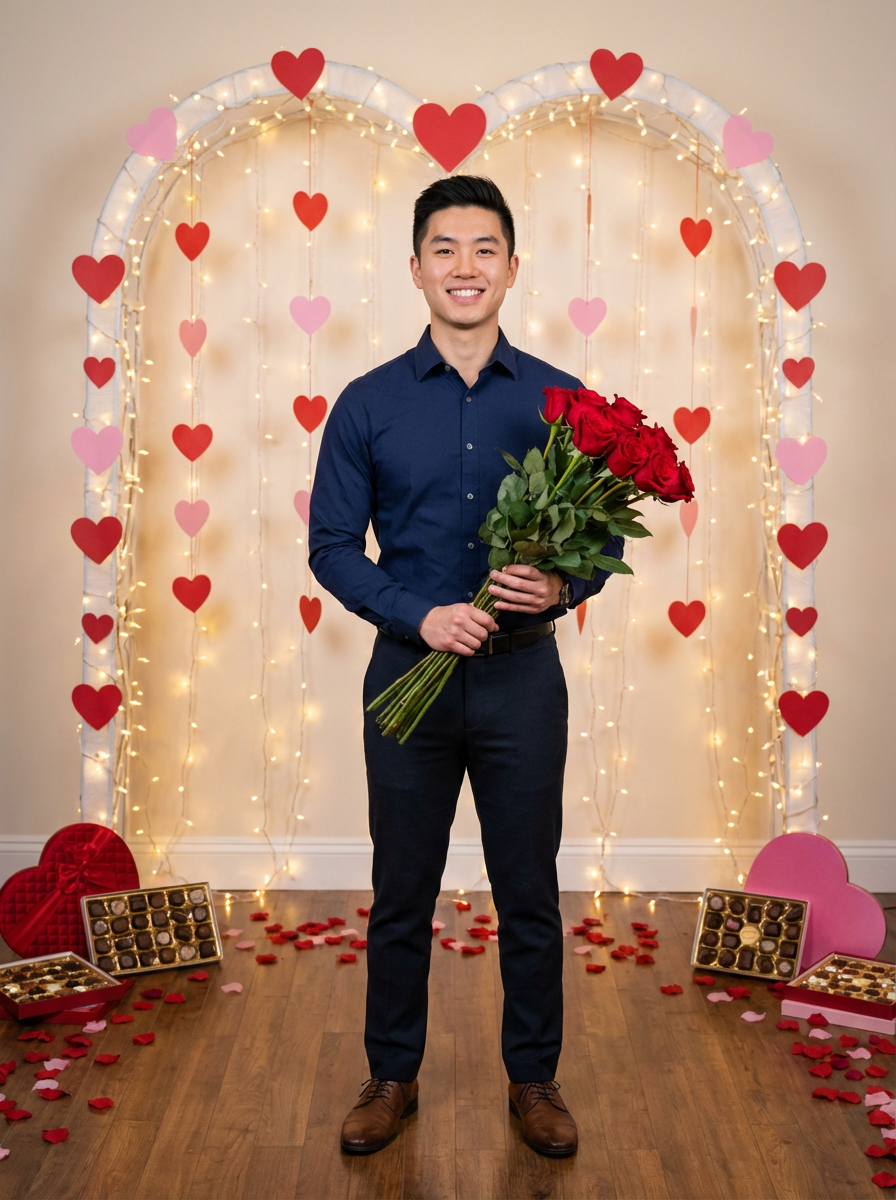 Model holding a bouquet of roses, smiling in front of a heart-shaped backdrop with Valentine's Day decorations like chocolates and rose petals.