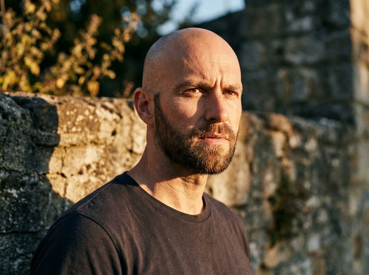Model in a candid golden hour moment. Intense pose, dramatic shadows. Documentary style with artistic lighting.