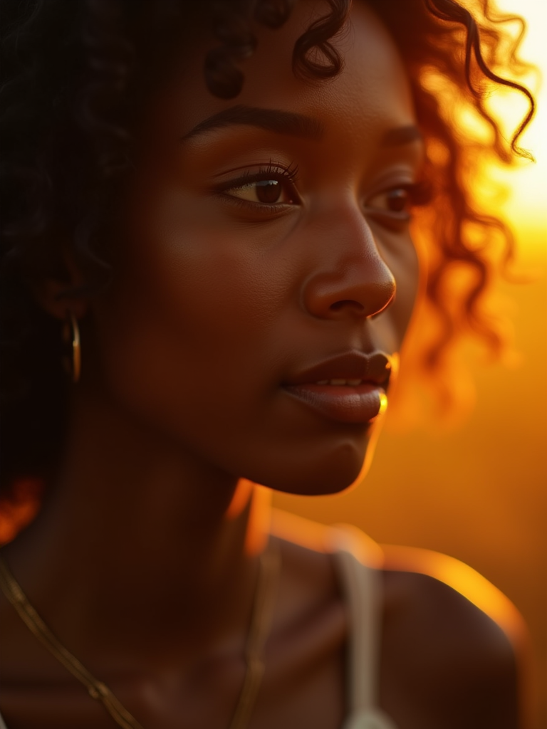 Model in a candid golden hour moment. Sensual expression, warm backlighting . Documentary style with artistic lighting.