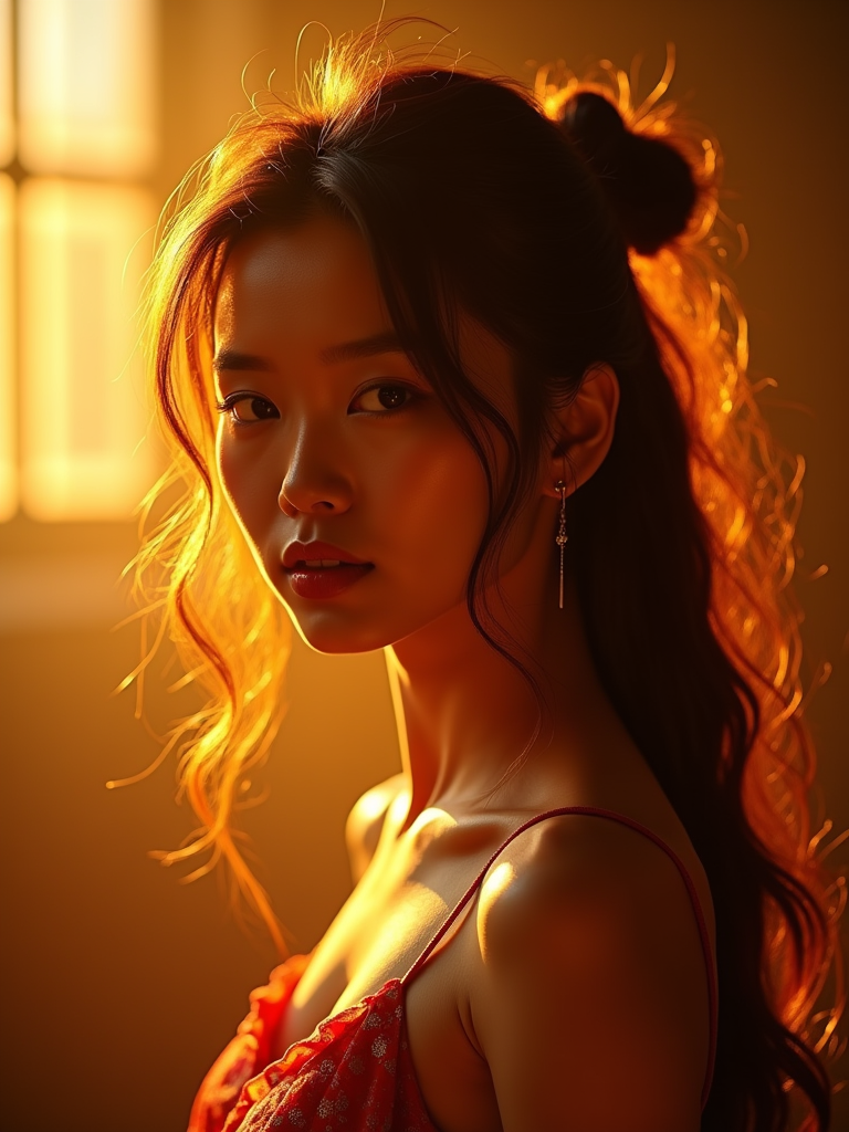 Model in a candid golden hour moment. Sensual expression, warm backlighting . Documentary style with artistic lighting.
