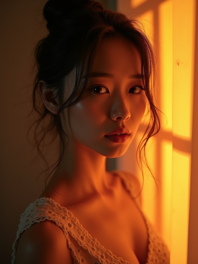 Model in a candid golden hour moment. Sensual expression, warm backlighting . Documentary style with artistic lighting.