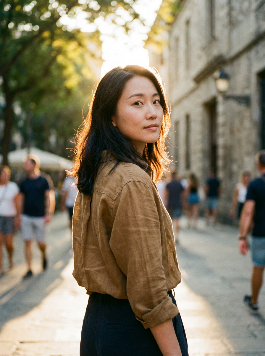 Model in a candid golden hour moment. Sensual expression, warm backlighting . Documentary style with artistic lighting.