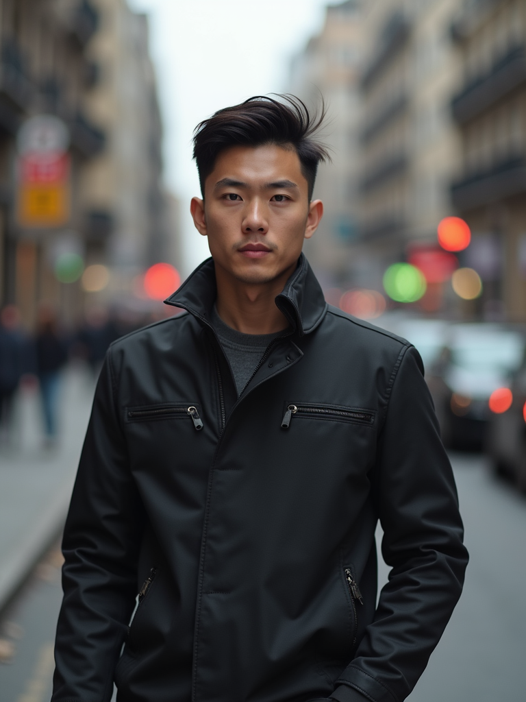 Model in a candid street photography style. Intense moment, city backdrop. Documentary photography aesthetic.