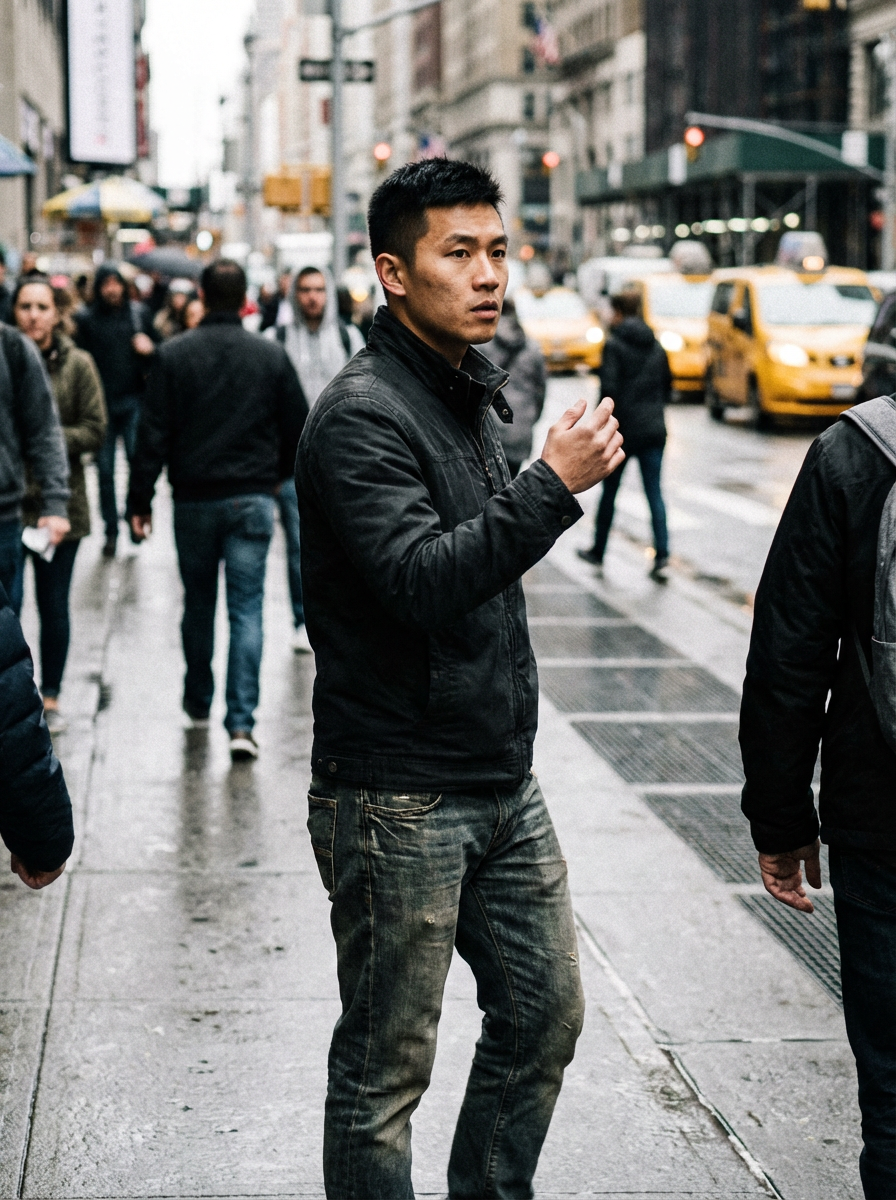 Model in a candid street photography style. Intense moment, city backdrop. Documentary photography aesthetic.