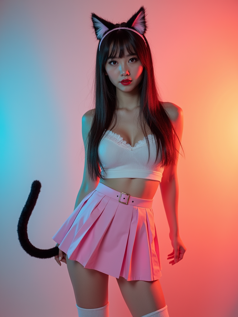 Model in a Catgirl cosplay photoshoot. Cat ears, tail, pleated skirt, thigh-high socks . Bright colorful background.