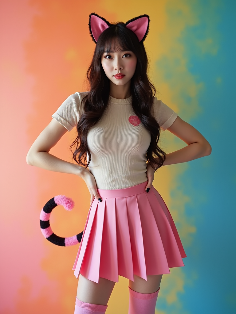 Model in a Catgirl cosplay photoshoot. Cat ears, tail, pleated skirt, thigh-high socks . Bright colorful background.