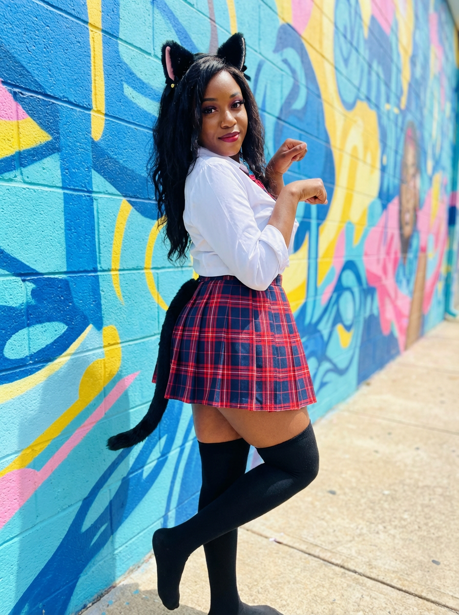 Model in a Catgirl cosplay photoshoot. Cat ears, tail, pleated skirt, thigh-high socks . Bright colorful background.