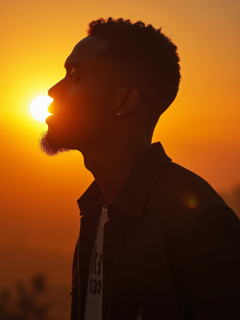 Model in a dreamy golden hour portrait. Backlit silhouette, warm rim lighting. Soft bokeh background, magical atmosphere.