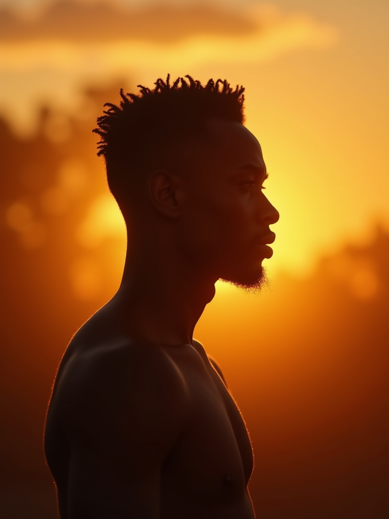 Model in a dreamy golden hour portrait. Backlit silhouette, warm rim lighting. Soft bokeh background, magical atmosphere.