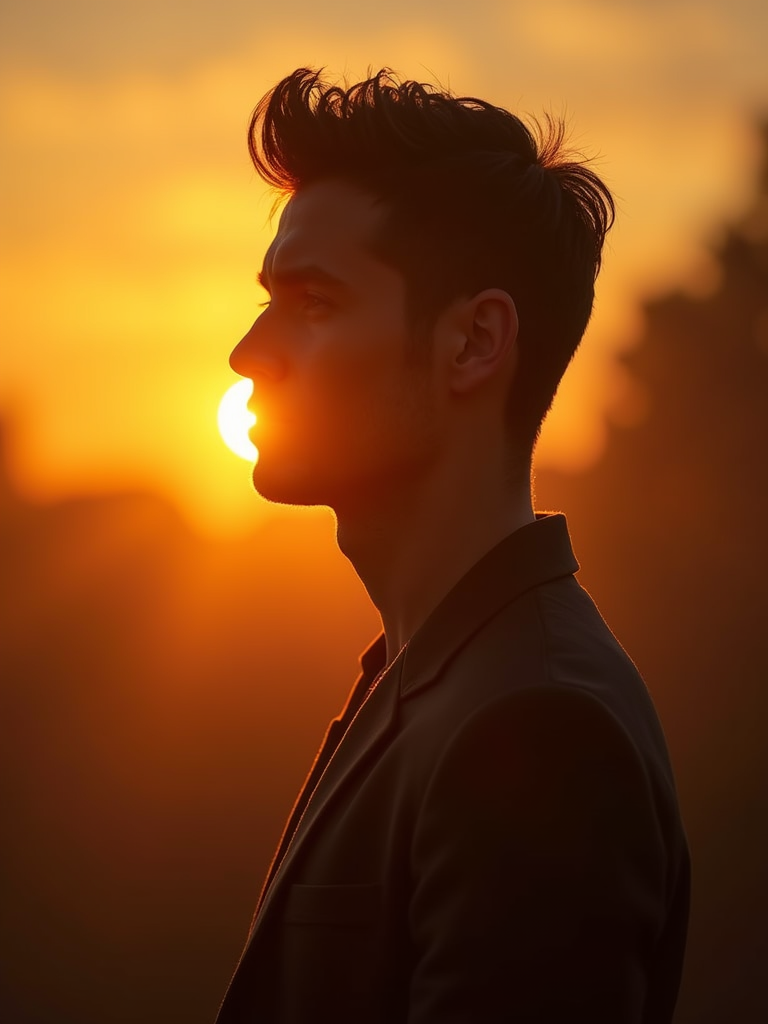Model in a dreamy golden hour portrait. Backlit silhouette, warm rim lighting. Soft bokeh background, magical atmosphere.