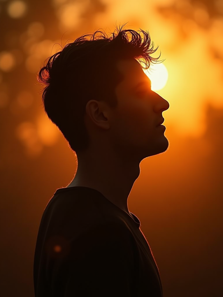 Model in a dreamy golden hour portrait. Backlit silhouette, warm rim lighting. Soft bokeh background, magical atmosphere.