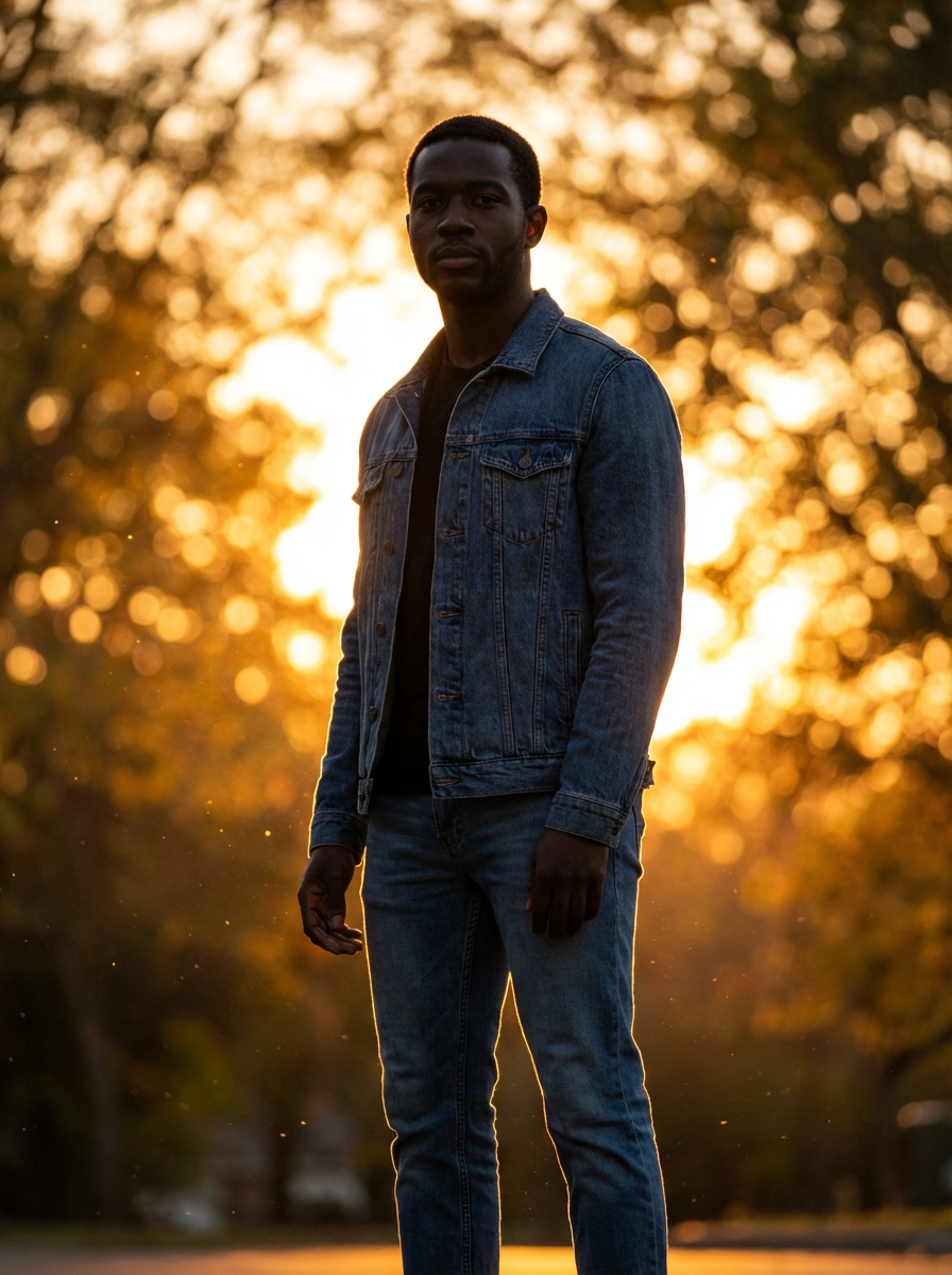 Model in a dreamy golden hour portrait. Backlit silhouette, warm rim lighting. Soft bokeh background, magical atmosphere.