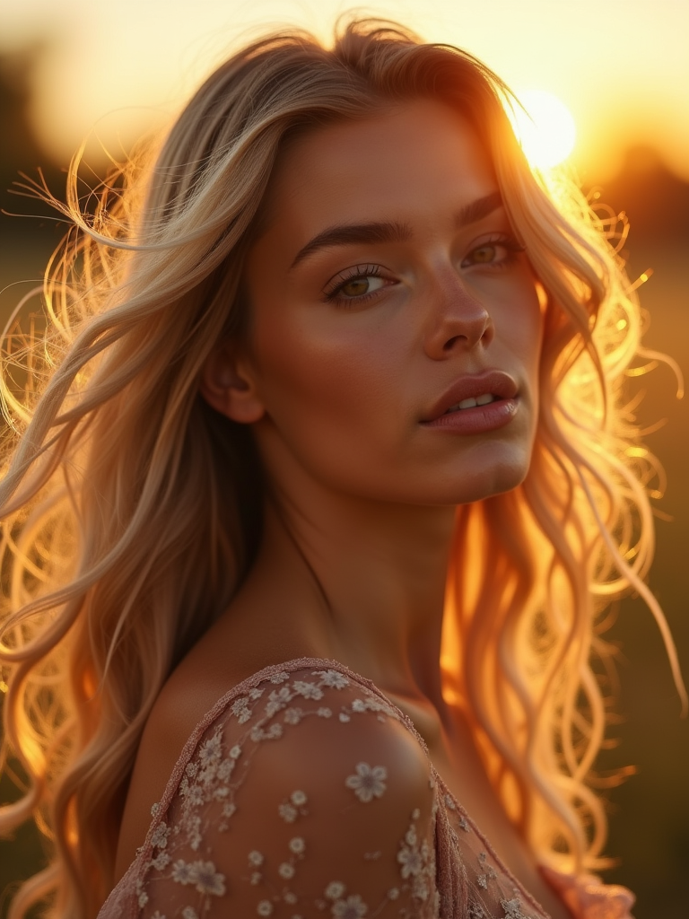 Model in a dreamy golden hour portrait. Flowing hair catching sunlight, ethereal glow, seductive expression . Soft bokeh background, magical atmosphere.