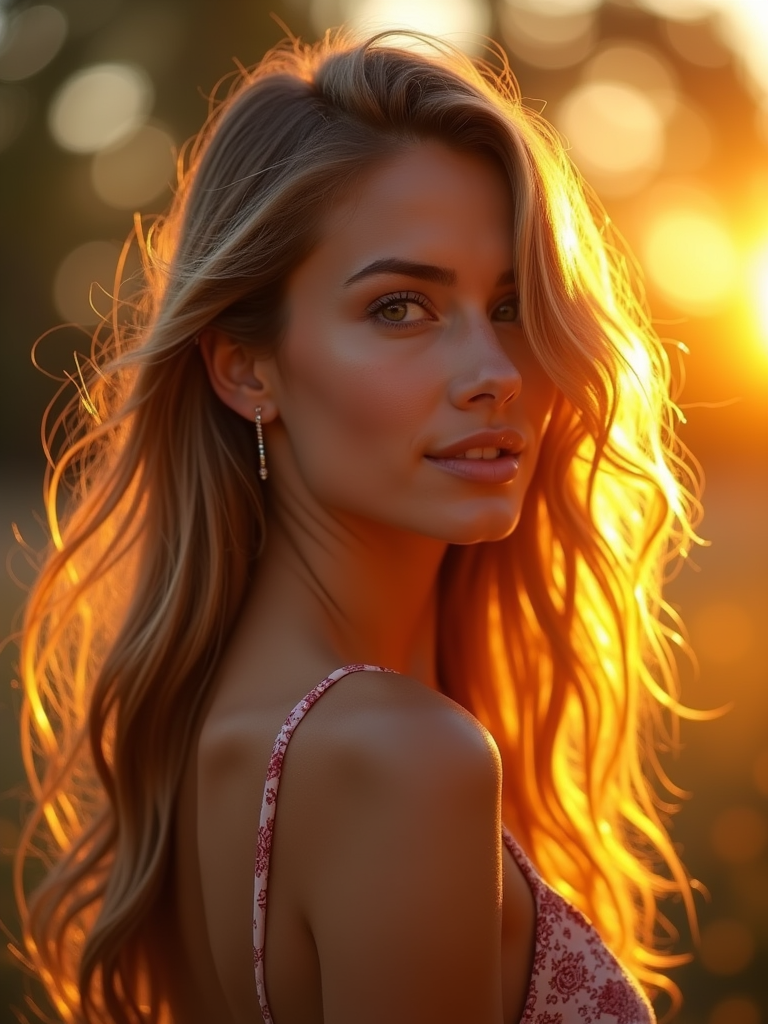 Model in a dreamy golden hour portrait. Flowing hair catching sunlight, ethereal glow, seductive expression . Soft bokeh background, magical atmosphere.