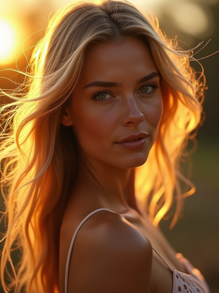 Model in a dreamy golden hour portrait. Flowing hair catching sunlight, ethereal glow, seductive expression . Soft bokeh background, magical atmosphere.