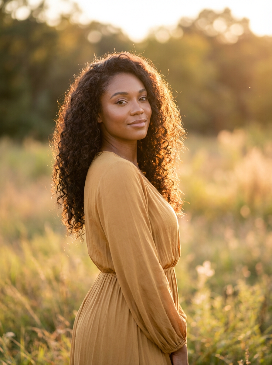 Model in a dreamy golden hour portrait. Flowing hair catching sunlight, ethereal glow, seductive expression . Soft bokeh background, magical atmosphere.