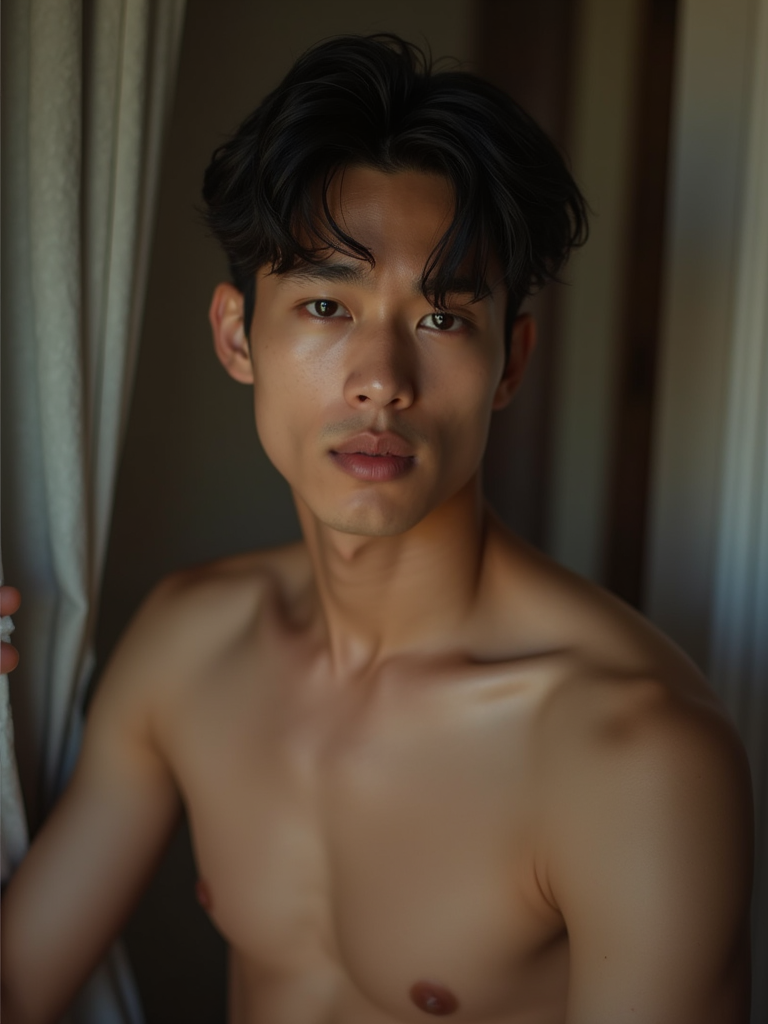 Model in a fine art boudoir style portrait. Classic pose, intense expression. Soft natural lighting, painterly quality.