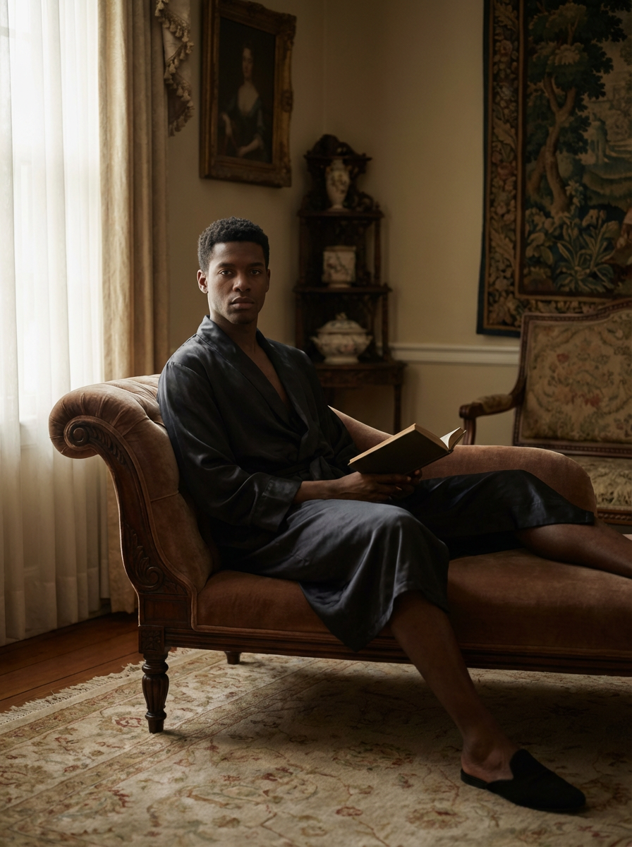 Model in a fine art boudoir style portrait. Classic pose, intense expression. Soft natural lighting, painterly quality.