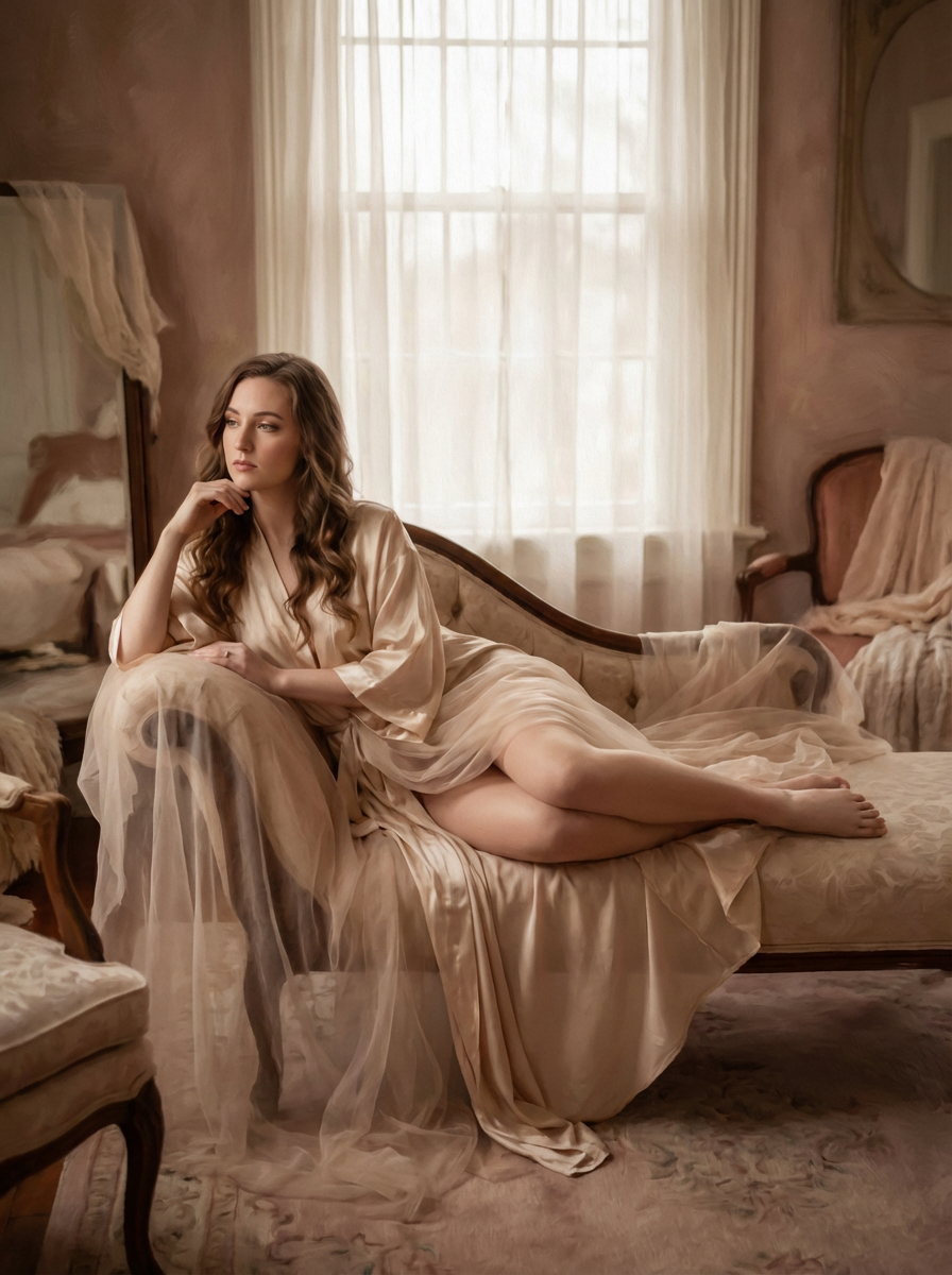 Model in a fine art boudoir style portrait. Flowing silk, seductive pose . Soft natural lighting, painterly quality.