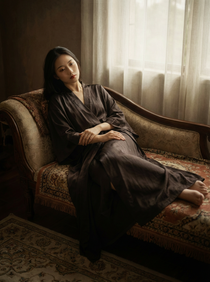 Model in a fine art boudoir style portrait. Flowing silk, seductive pose . Soft natural lighting, painterly quality.