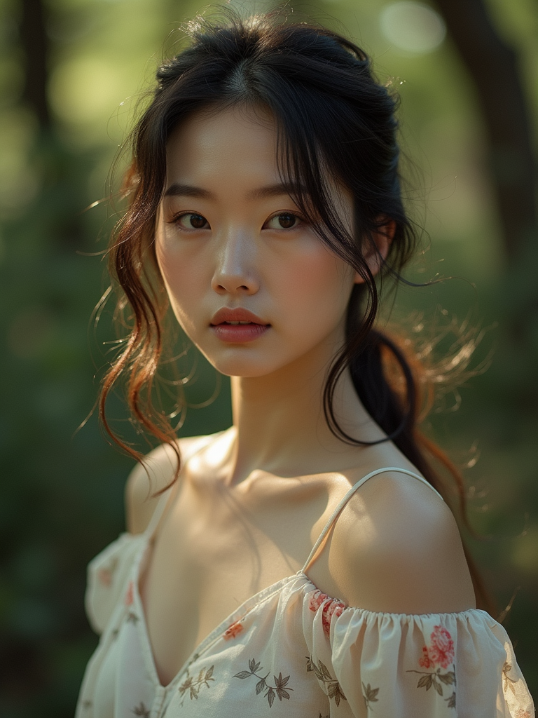 Model in a natural outdoor portrait. Soft natural light through trees, sensual shadows . Environmental portrait, organic lighting.