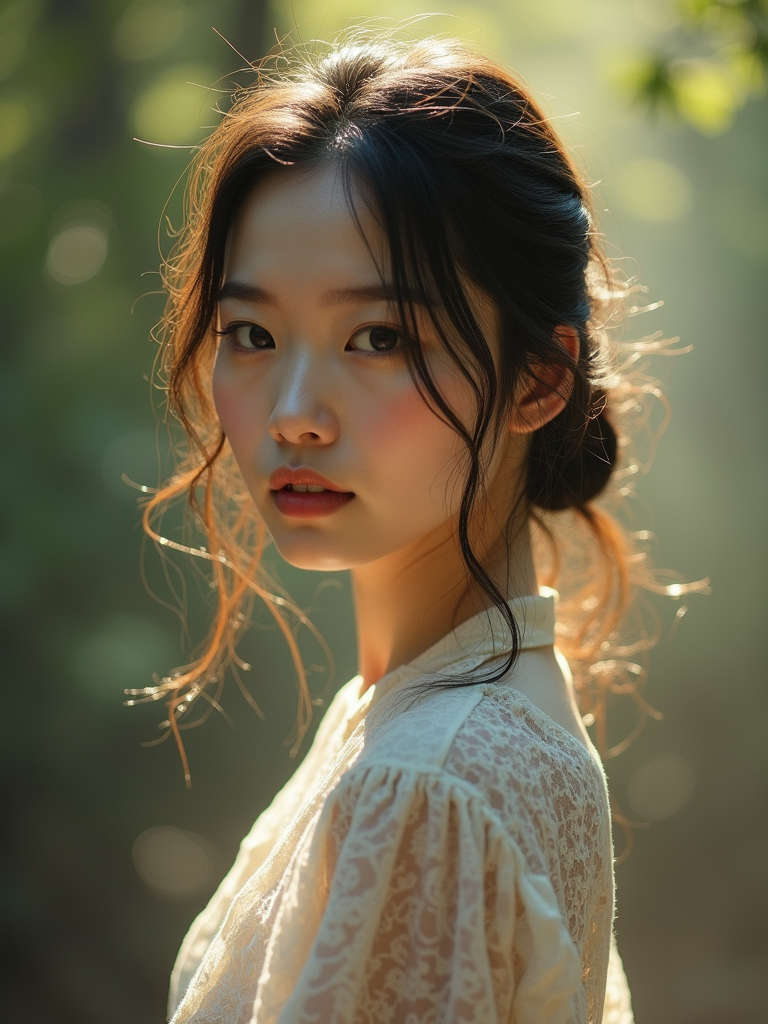 Model in a natural outdoor portrait. Soft natural light through trees, sensual shadows . Environmental portrait, organic lighting.