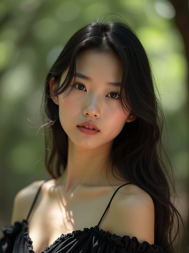 Model in a natural outdoor portrait. Soft natural light through trees, sensual shadows . Environmental portrait, organic lighting.
