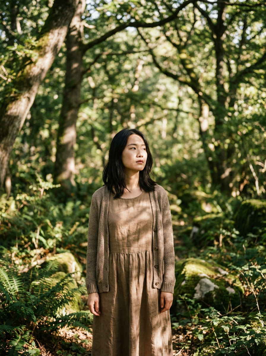 Model in a natural outdoor portrait. Soft natural light through trees, sensual shadows . Environmental portrait, organic lighting.