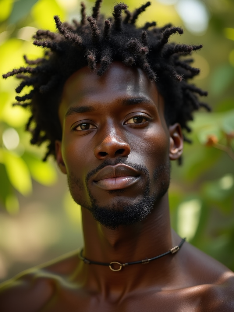 Model in a natural outdoor portrait. Warm sunlight filtering through leaves. Environmental portrait, organic lighting.