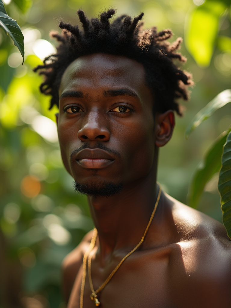 Model in a natural outdoor portrait. Warm sunlight filtering through leaves. Environmental portrait, organic lighting.