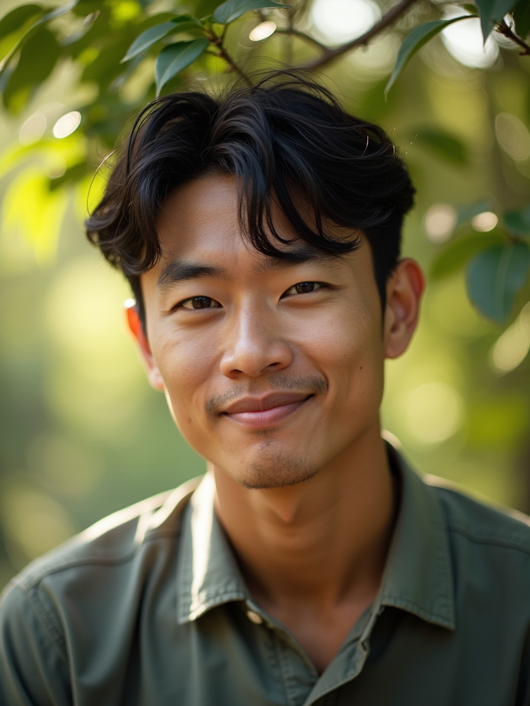 Model in a natural outdoor portrait. Warm sunlight filtering through leaves. Environmental portrait, organic lighting.