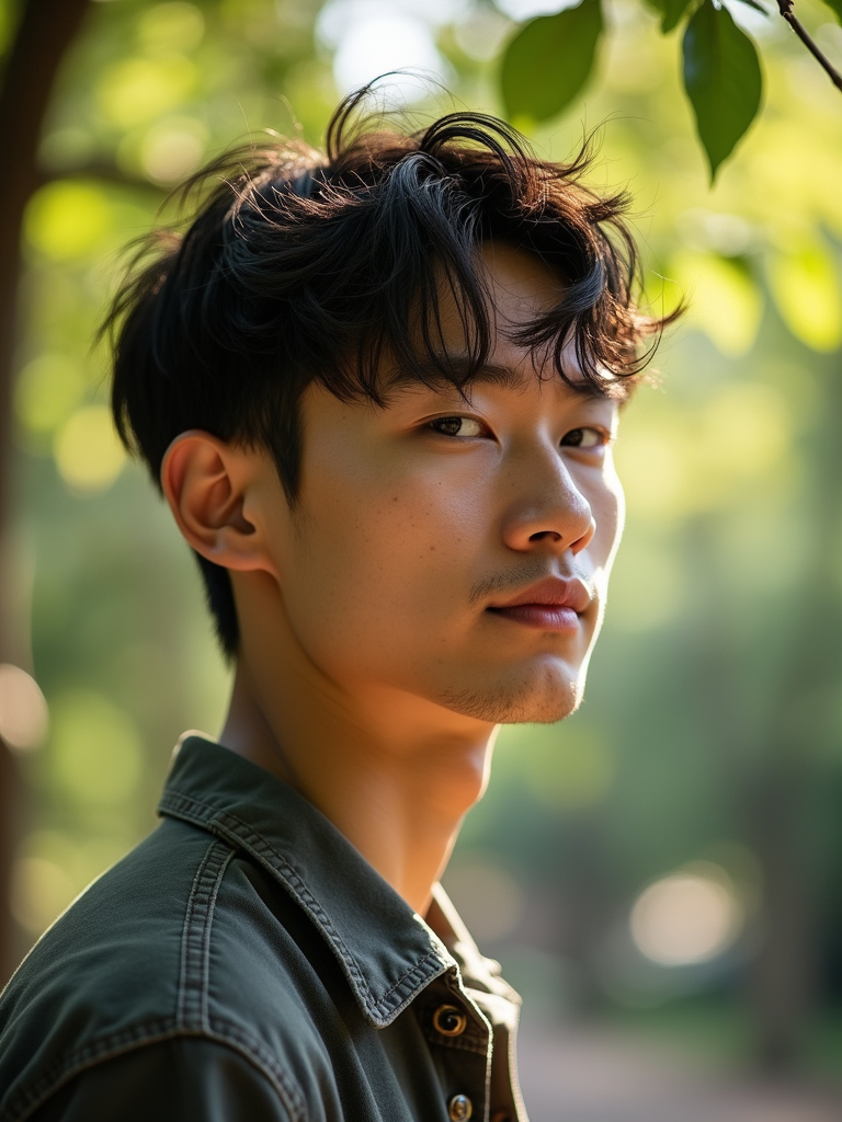 Model in a natural outdoor portrait. Warm sunlight filtering through leaves. Environmental portrait, organic lighting.