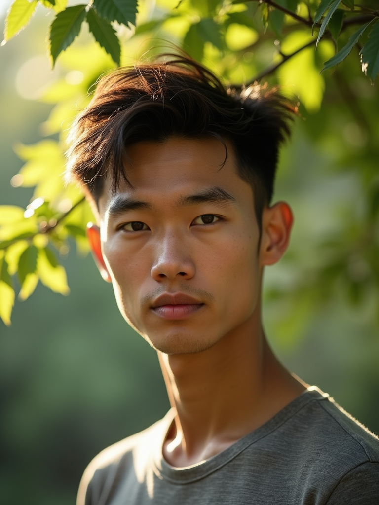Model in a natural outdoor portrait. Warm sunlight filtering through leaves. Environmental portrait, organic lighting.