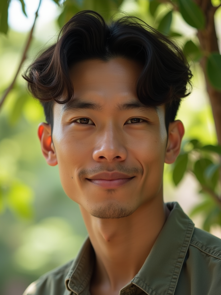 Model in a natural outdoor portrait. Warm sunlight filtering through leaves. Environmental portrait, organic lighting.