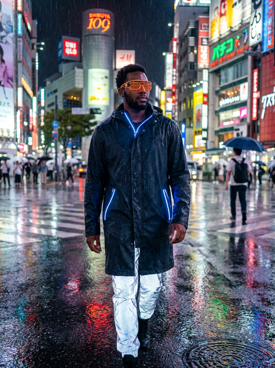 Model in a rainy night in Shibuya, reflections of neon lights on the wet streets. Dark neon-lit outfit, glowing cyberpunk glasses. Cyberpunk realism.