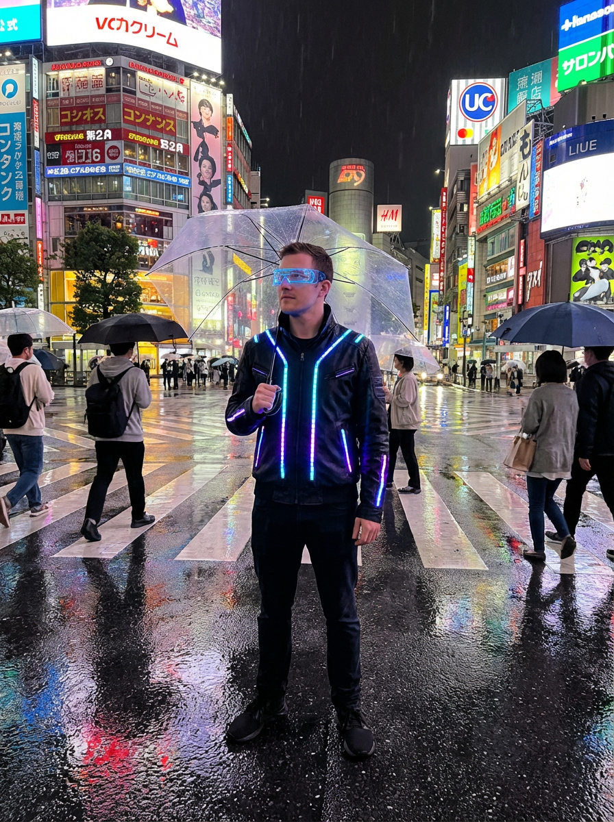 Model in a rainy night in Shibuya, reflections of neon lights on the wet streets. Dark neon-lit outfit, glowing cyberpunk glasses. Cyberpunk realism.