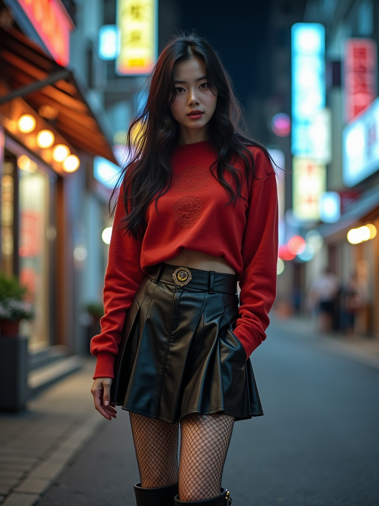 Model in an E-Girl streetwear fashion shoot. Fishnet stockings, pleated skirt, chunky boots . Urban background, city lights.